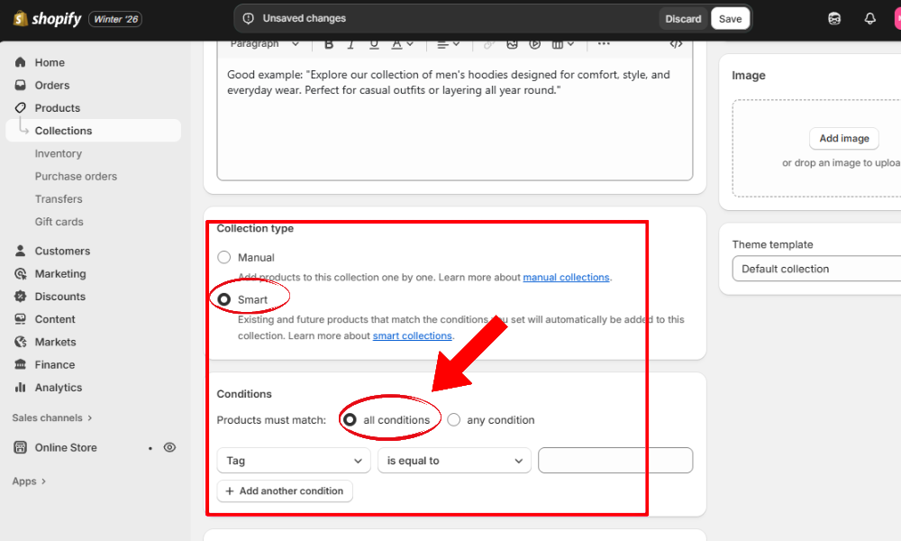 Good example: Product type = "Shirt" AND tag contains "summer" → Creates a smart collection of summer shirts automatically